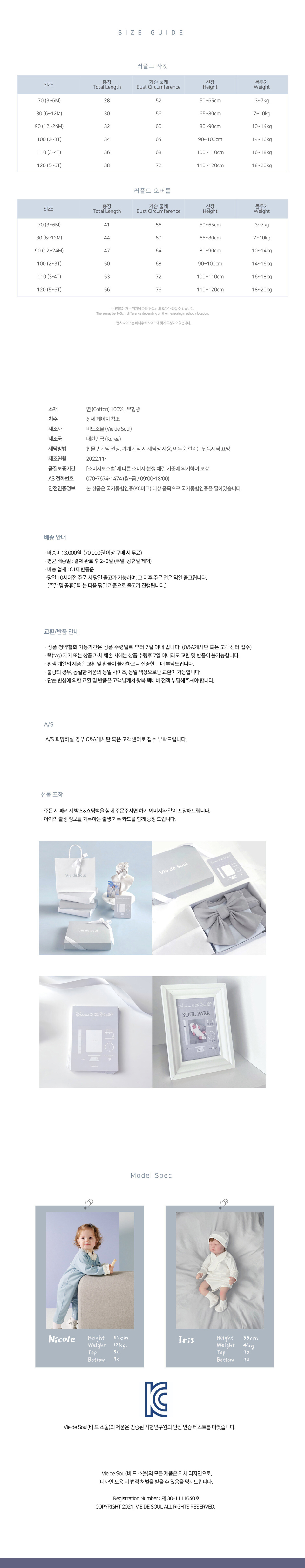 *오버롤 하단의 스냅은 기저귀 갈기에 용이한 용도로 70,80 사이즈에만 부착되어 있으며, 90~110사이즈는 스냅 없이 제작되었습니다.