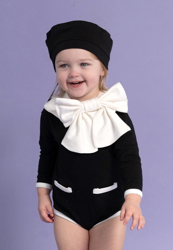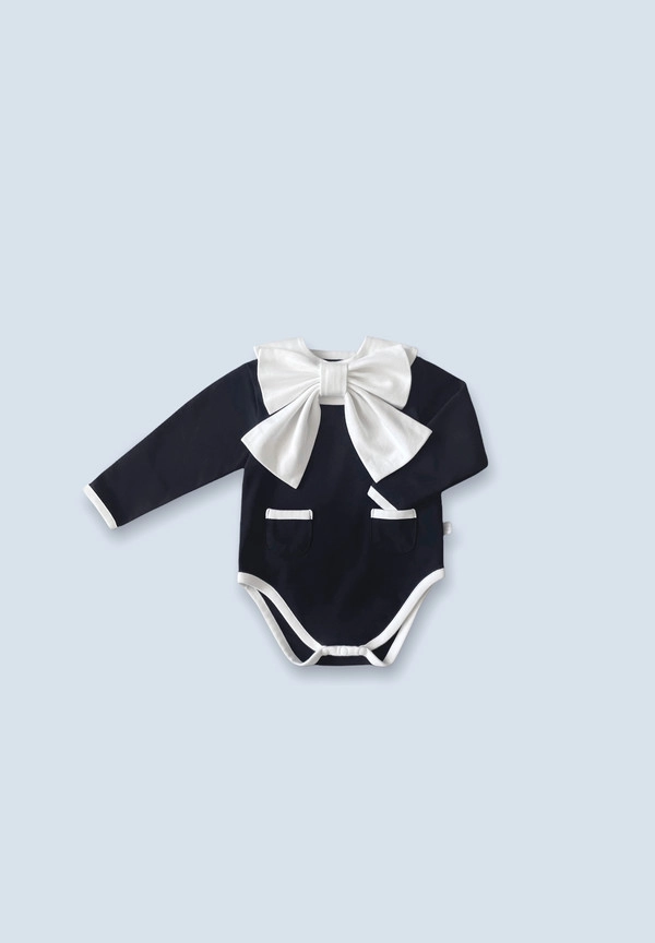 바디수트의 배색 라인과 앙증맞은 사이즈의 포켓 디테일이 미니멀함 속 포인트가 되어줍니다. 리본 스카프빕과 함께 매치하면 포멀한 분위기가 연출되어 셀프 스냅 촬영룩으로 활용하기 좋습니다.