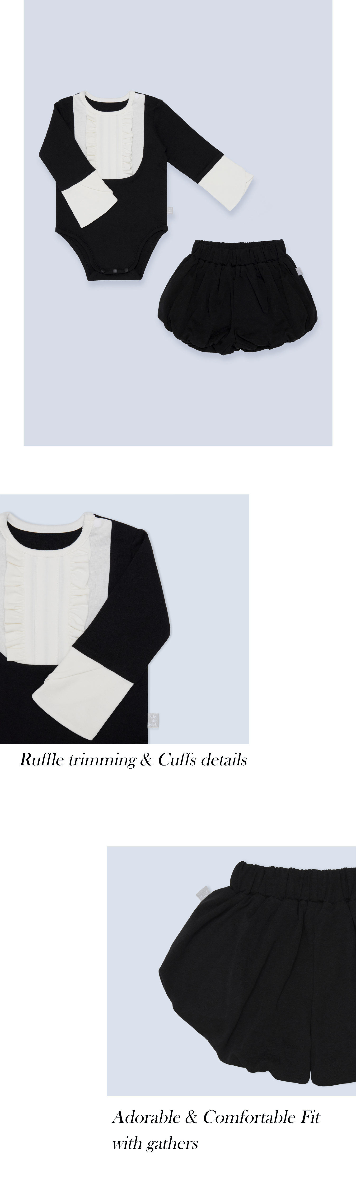 섬세하게 트리밍한 프릴 패널과 소매 커프스 디테일이 고급스럽고 클래식한 분위기를 자아내는 클래시 바디수트 세트입니다. 러블리한 핏을 자아내는 클라우드 블루머의 넉넉한 주름 분량은 쉴 새 없이 움직이는 우리 아기에게 편안함을 선사합니다.