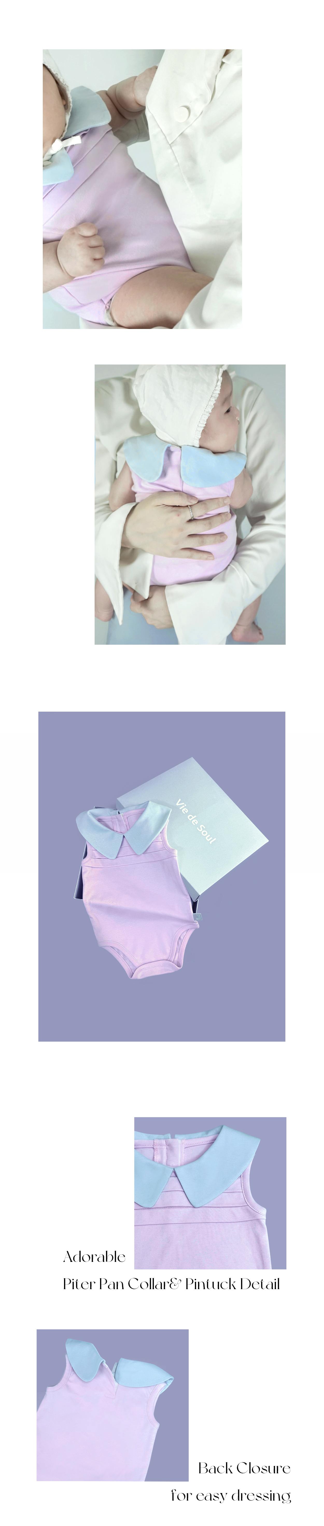 아기 얼굴을 부드럽게 감싸는 피터팬 칼라와 섬세하게 잡아낸 핀턱 디테일이 만나 순수하면서도 단정한 실루엣을 완성합니다.