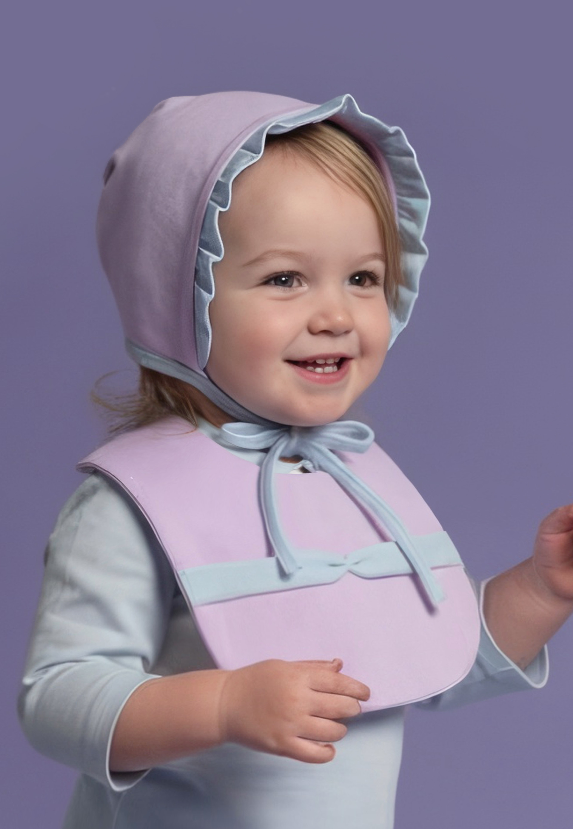 보넷의 정제된 프릴 폭과 스카프빕의 단정한 리본 바 실루엣이 어우러져,