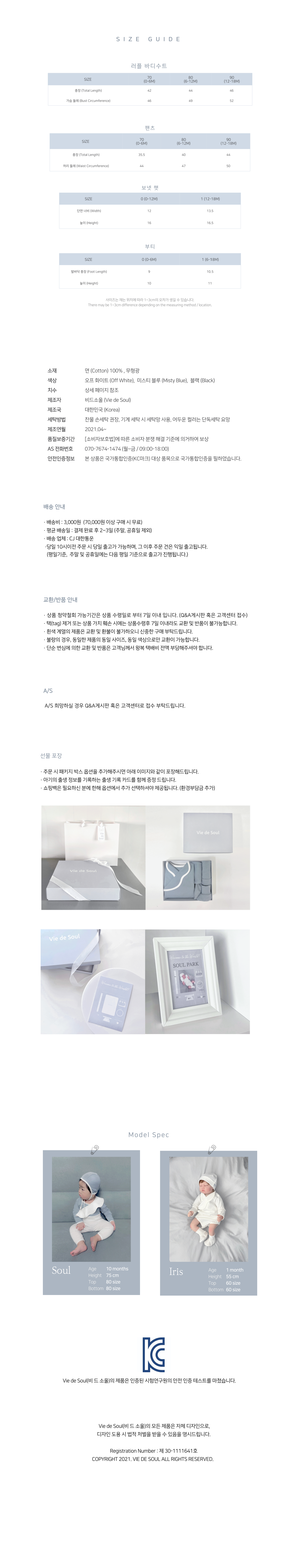 세트 상품인 보넷햇과 발싸개 그리고 팬츠를 활용하여 다양하게 연출이 가능합니다. 원톤으로 혹은 화이트 컬러와 믹스매치 하여 우리 아기의 스타일 지수를 업 해주세요!
