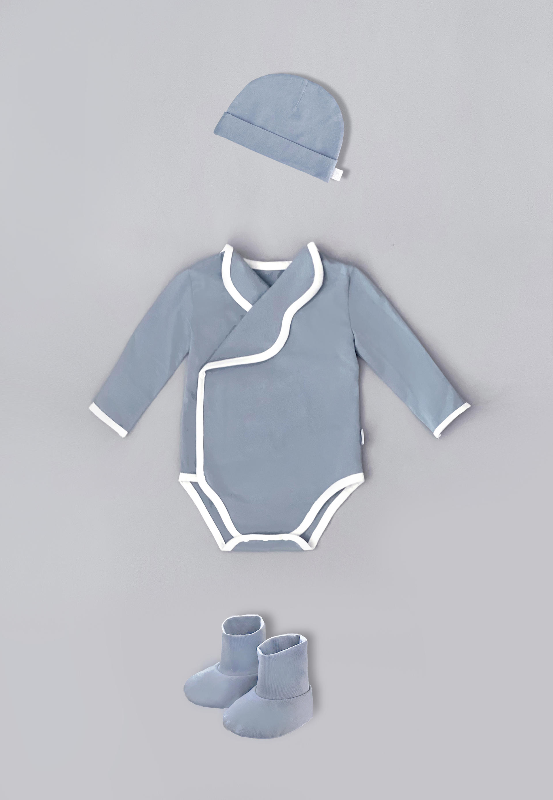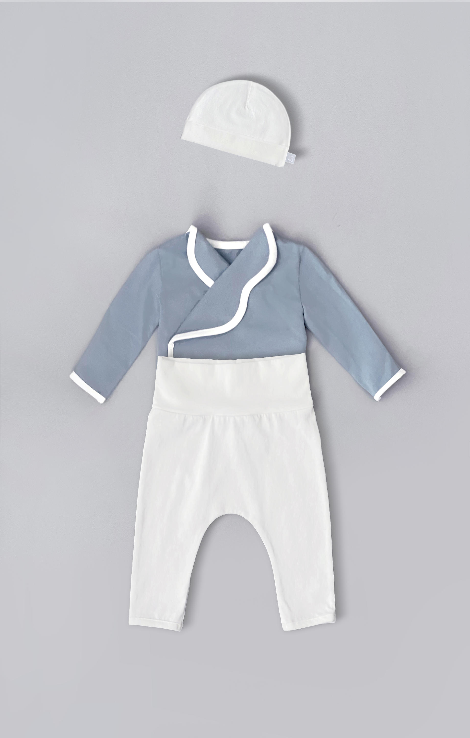 버튼이 달린 오픈형으로 착용하기 쉽고, 더블 오버랩 디자인 덕분에 배앓이를 방지해줍니다. 소매 밑단은 두겹으로 덧대어, 손을 씌워주면 손싸개 역할을 해줍니다.
