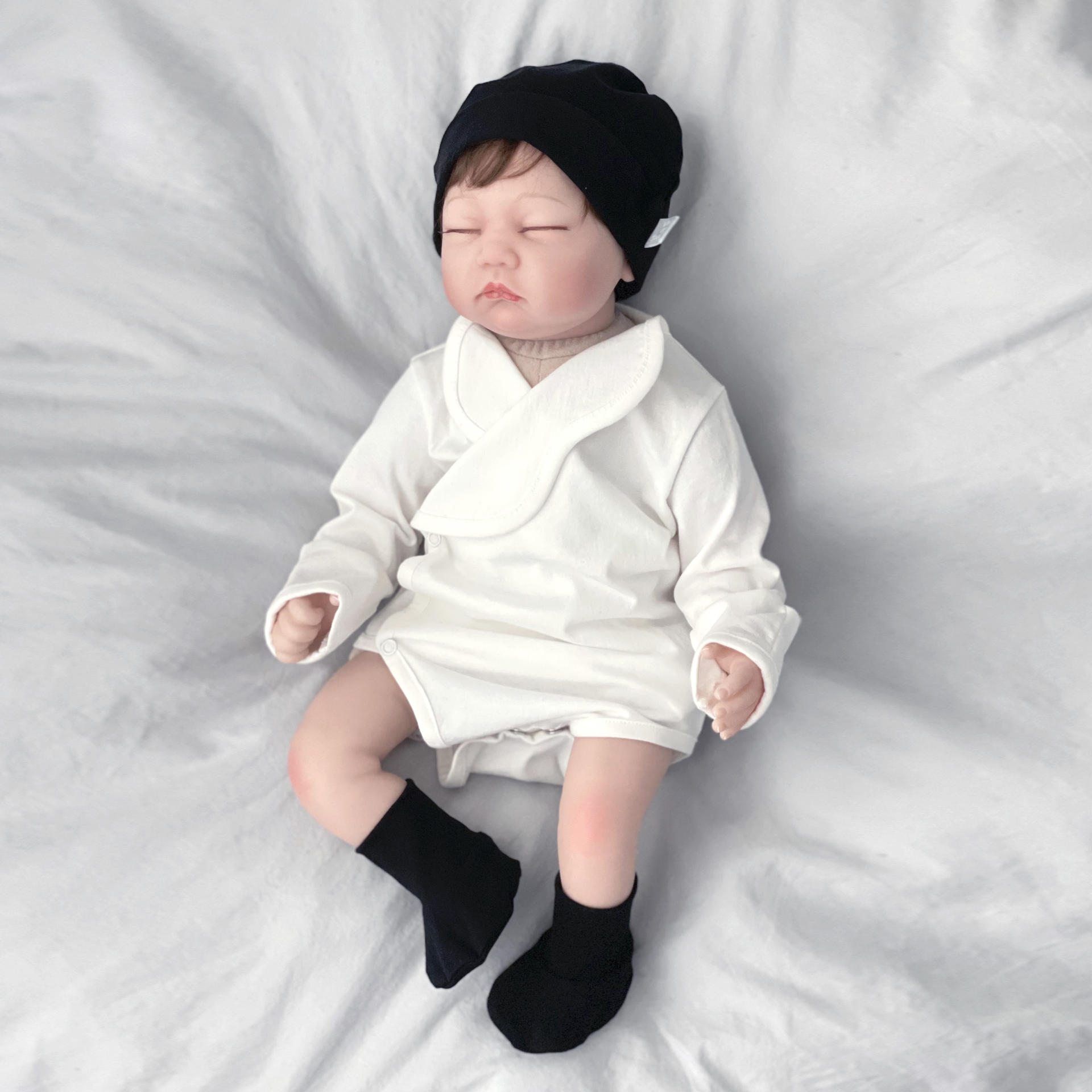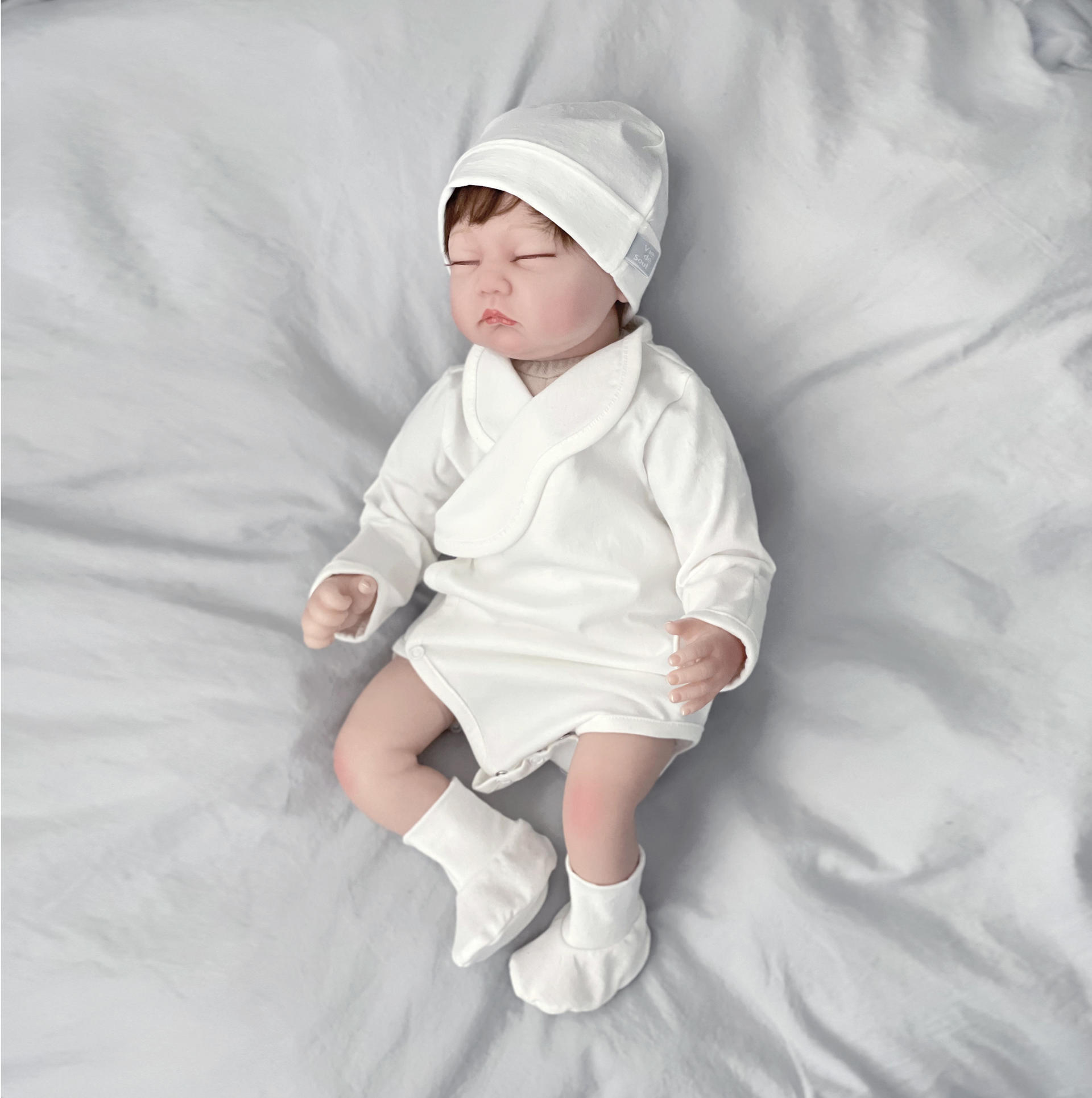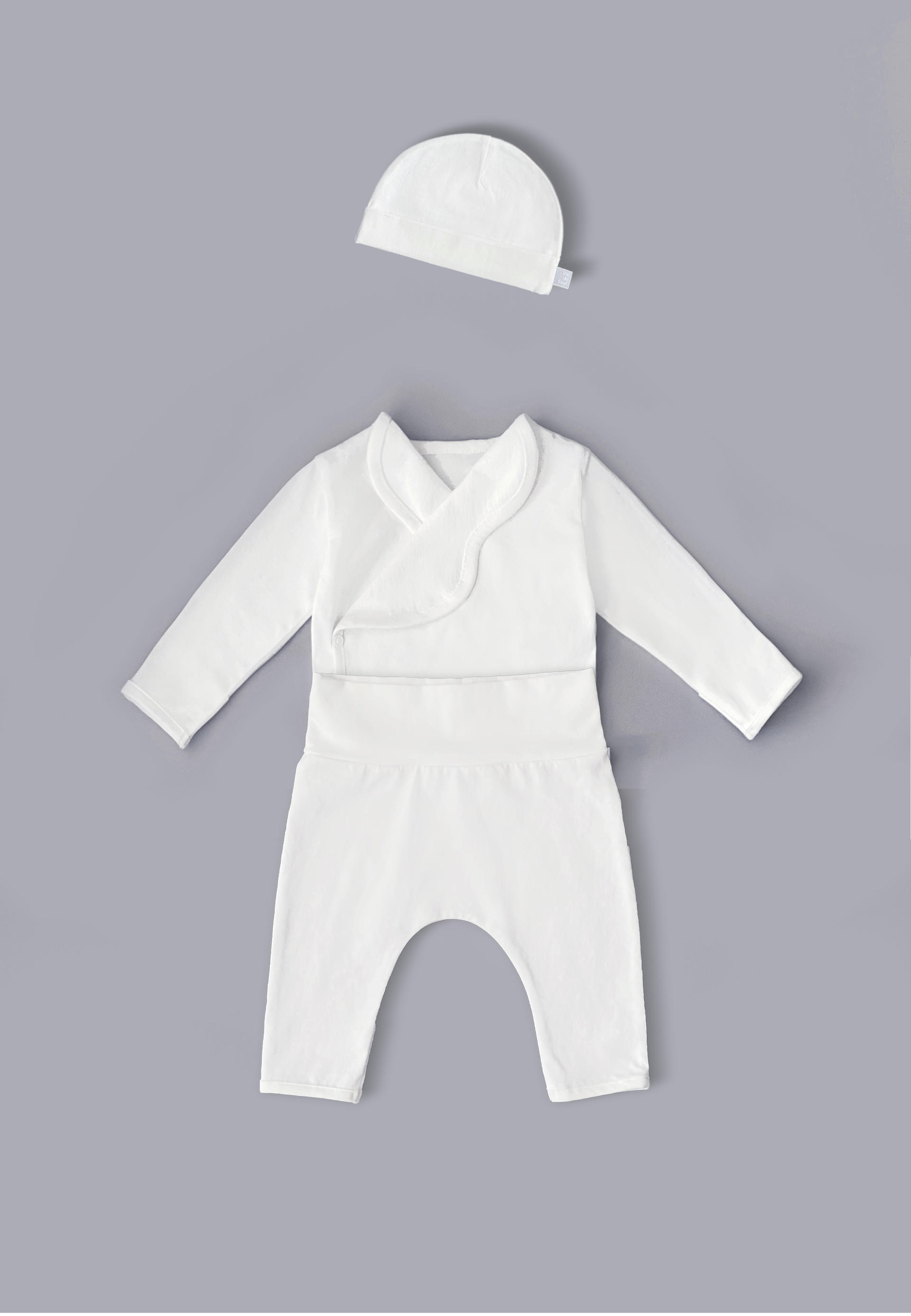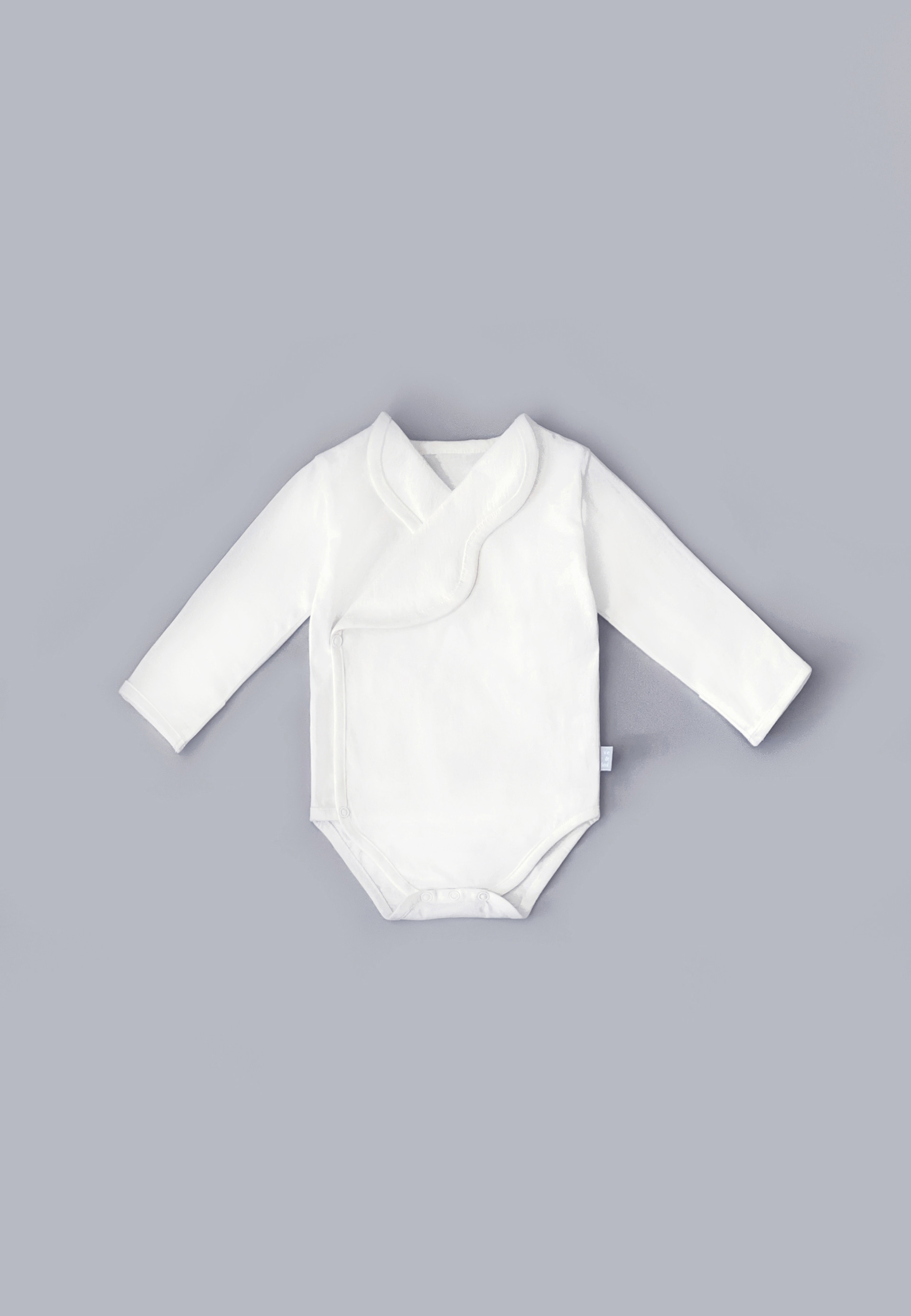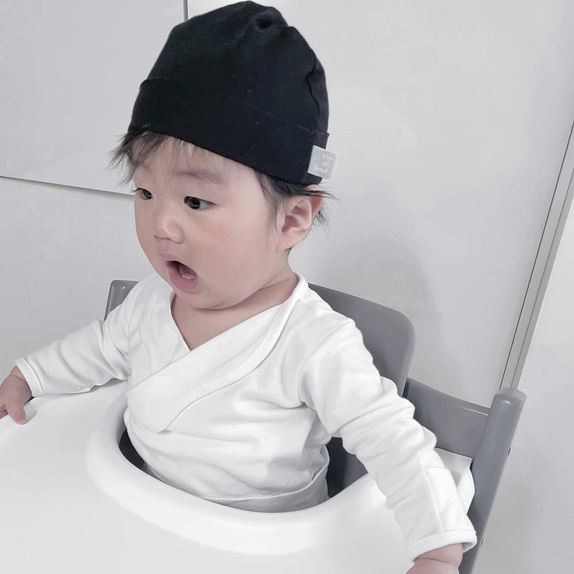 더블 오버랩 디자인으로, 배부분을 두번 감싸주어 배앓이를 방지해줍니다. 소매 부분을 두겹으로 덧대어 필요 시 뒤집어주면 손싸개 역할을 해줍니다. 입고 벗기 쉽도록 스냅 버튼을 사용하였습니다.
