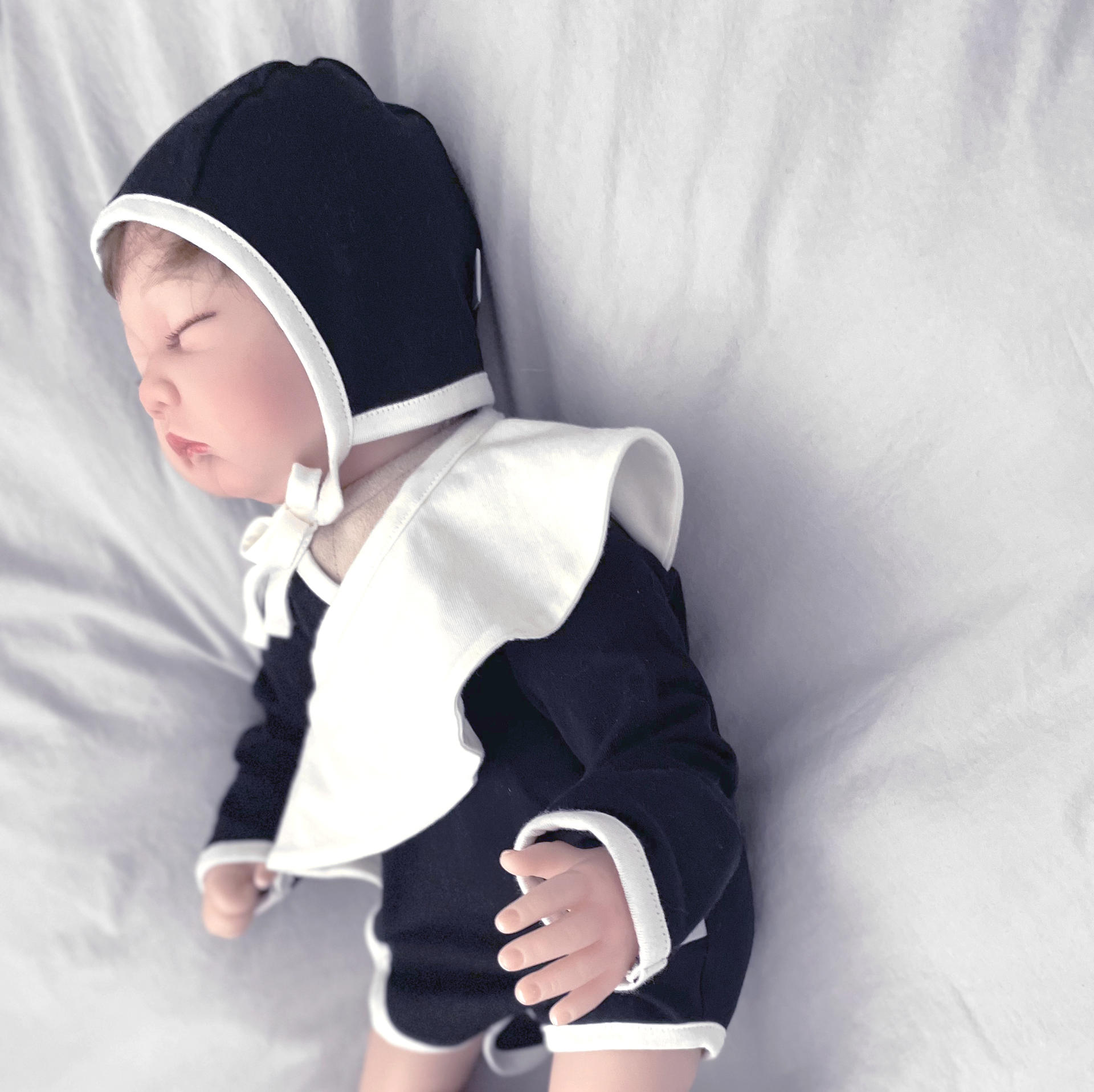 가볍고 구김이 적은 소재로, 기저귀가방에 쏘옥 넣어다니기 좋은 보넷입니다.