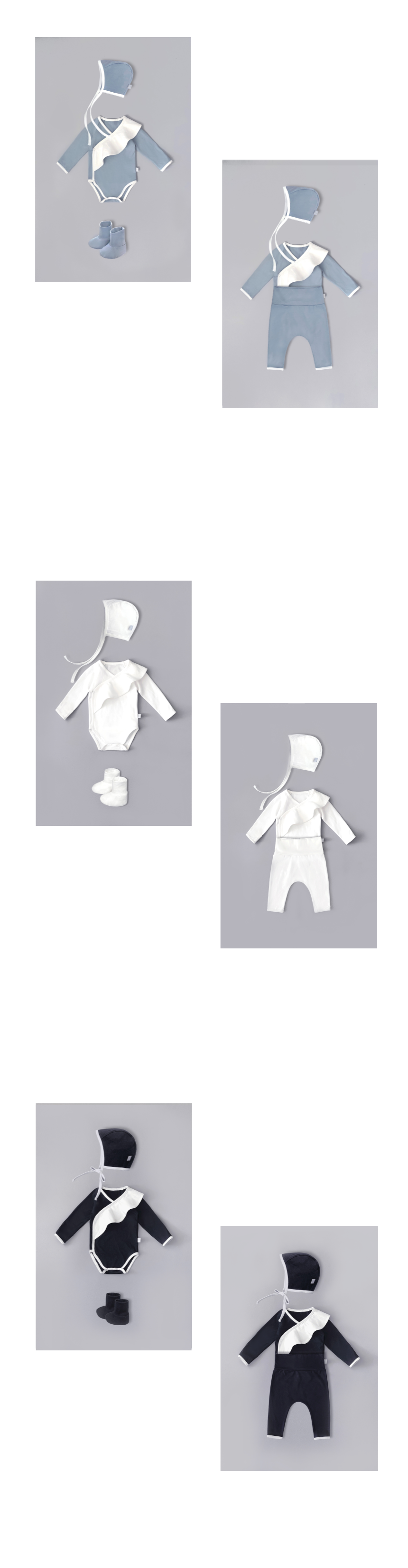 기온과 아기 체온에 맞게 발싸개 혹은 팬츠를 활용하여 다양한 연출이 가능한 만능 세트입니다.