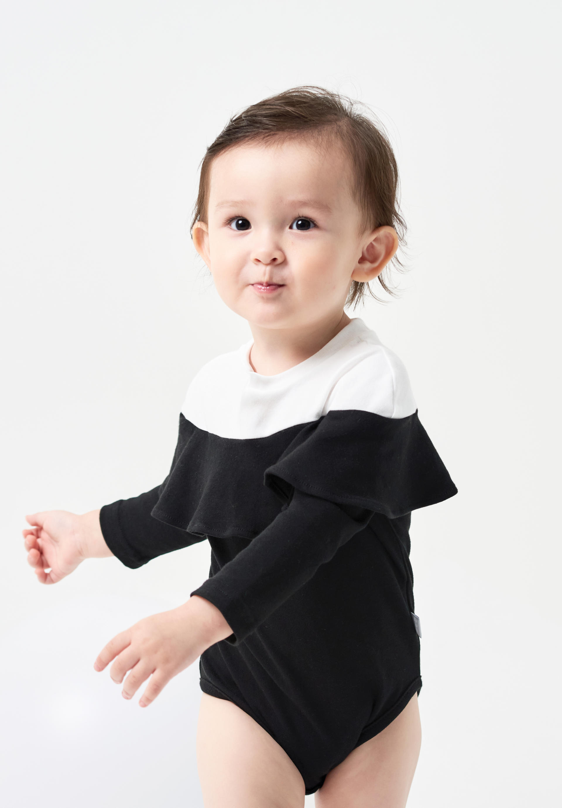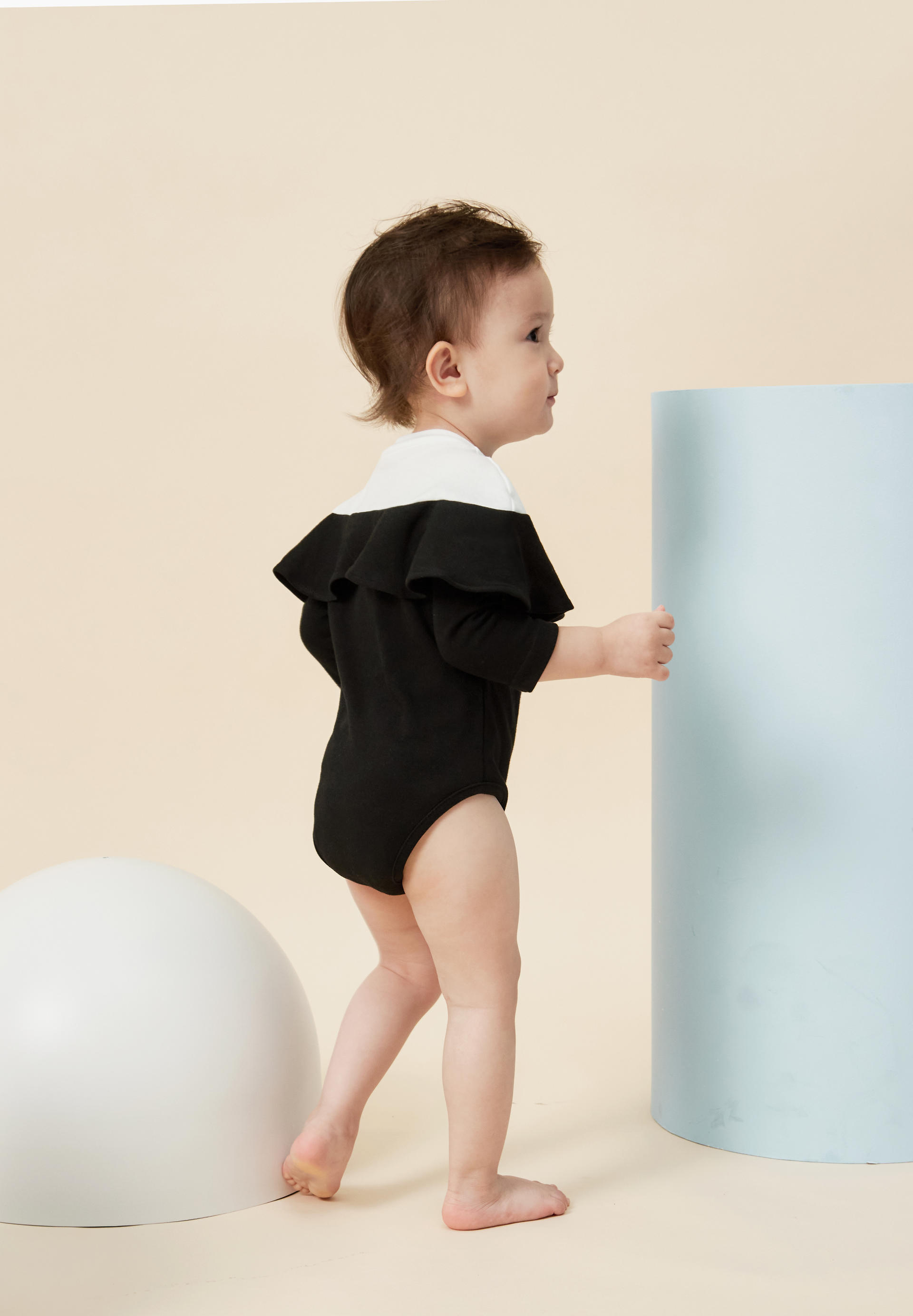 아가의 가녀린 어깨 라인을 타고 내려와 몸을 감싸주는 러플 디자인이 마치 천사의 날개를 연상시키는 바디수트입니다.