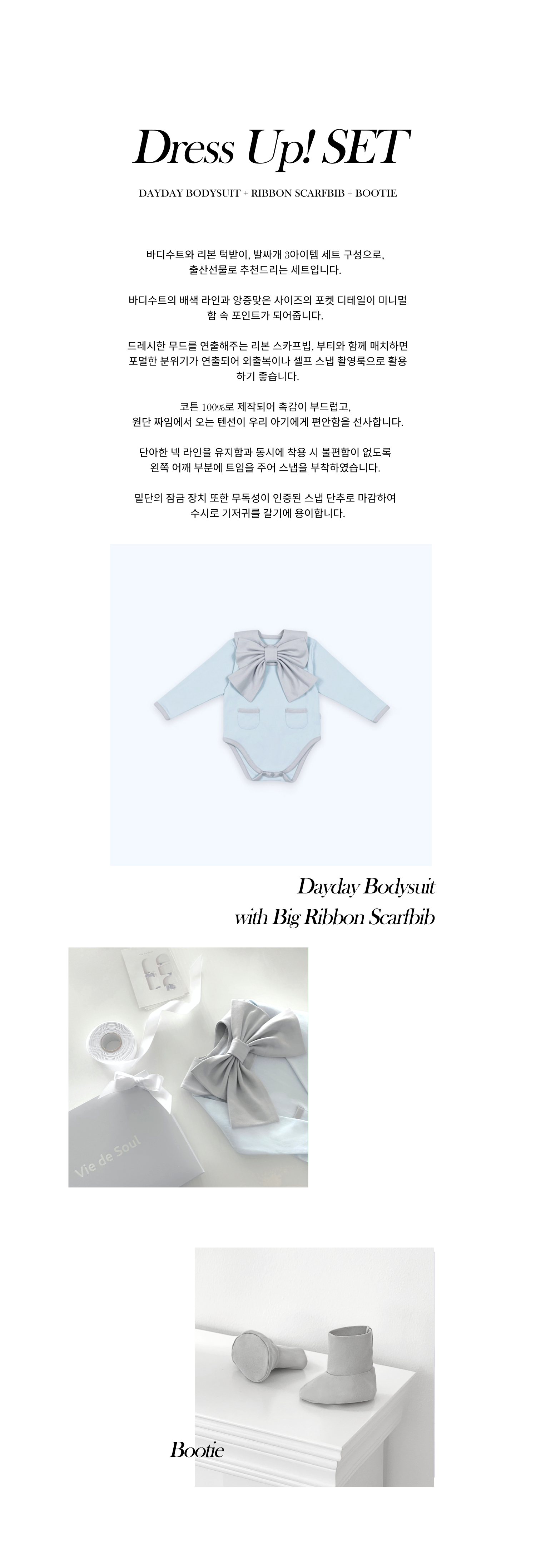 데일리로 활용하기 좋은 베이직 바디수트와 드레시한 무드를 자아내는 리본 턱받이와 발싸개 세트입니다.